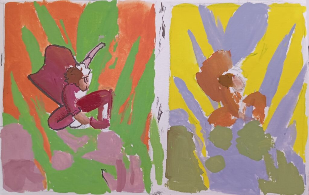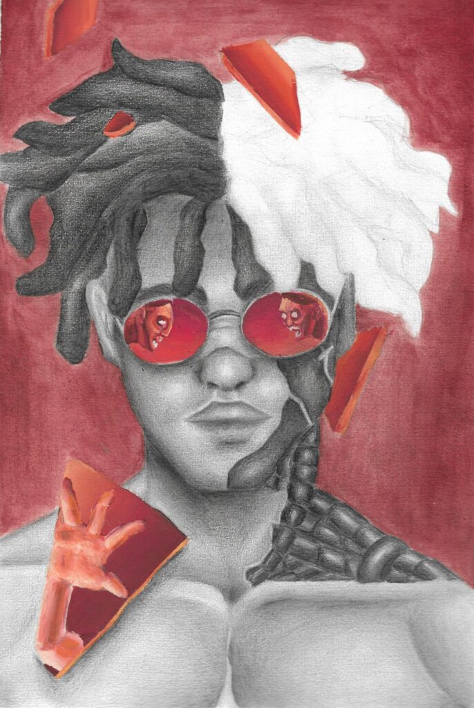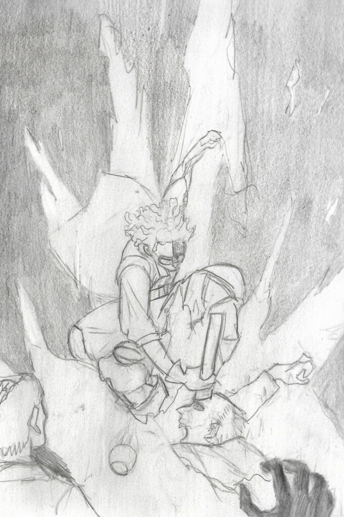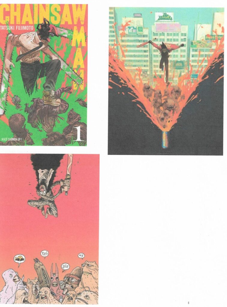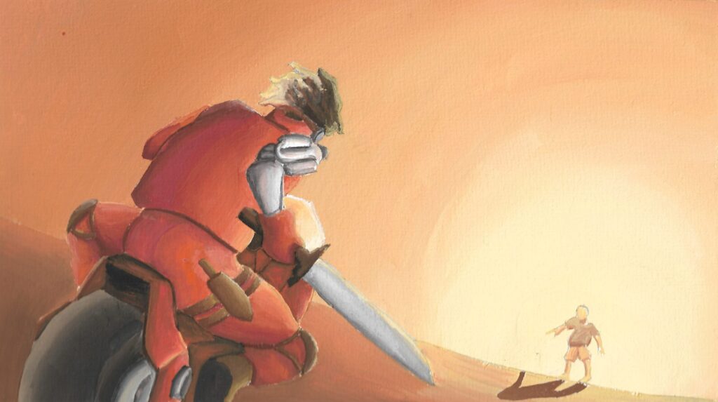 Pour le charadesign je me suis fortement inspirée du manga Akira, l’univers m’inspirait beaucoup pour ce thème. Le manga Chainsaw Man a été une source d’inspiration importante aussi, j’ai tout de suite pensé au premier chapitre du livre quand j’ai lu la fable. Je me suis donc principalement inspirée de ces deux œuvres pour créer mes illustrations.