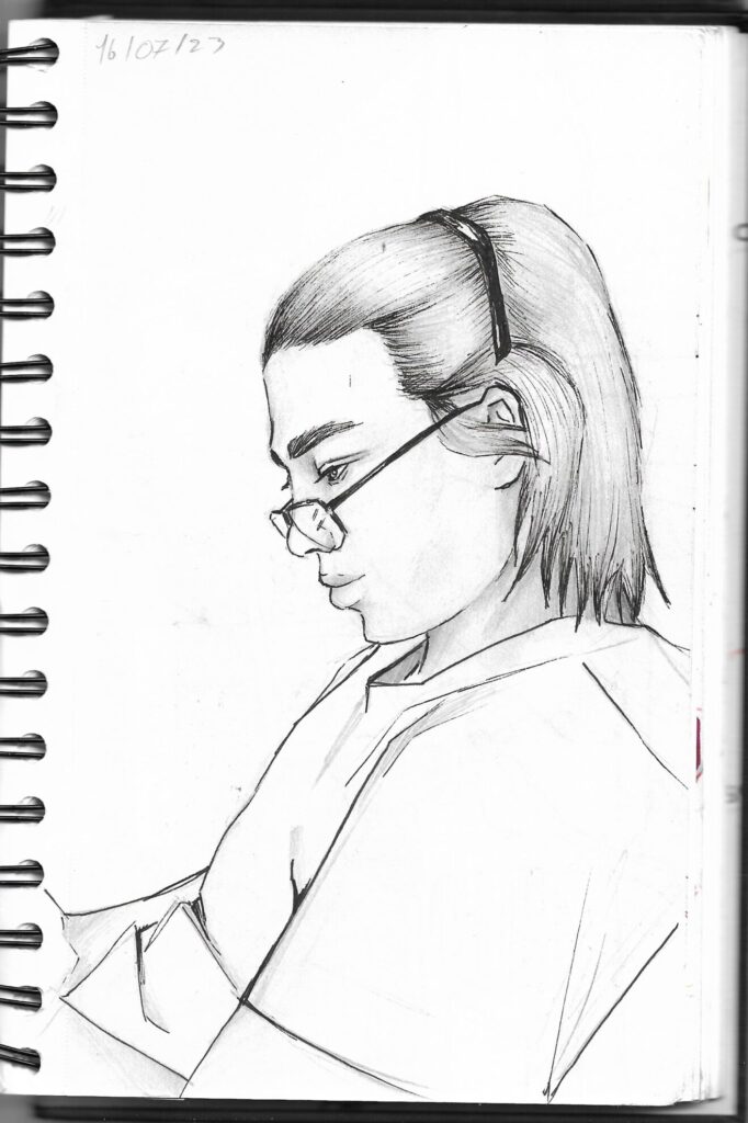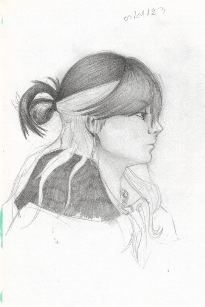 Le premier portrait est en format A3, tous les autres sont des pages de mon carnet de croquis donc un peu plus petit que du A5. Le deuxième portrait a été un vrai défi car la position du visage n’était pas facile à recopier. Je suis contente du résultat bien qu’avec du recul, je me suis trop éloignée de la référence, mon dessin manque de volume et ne respecte pas la perspective.